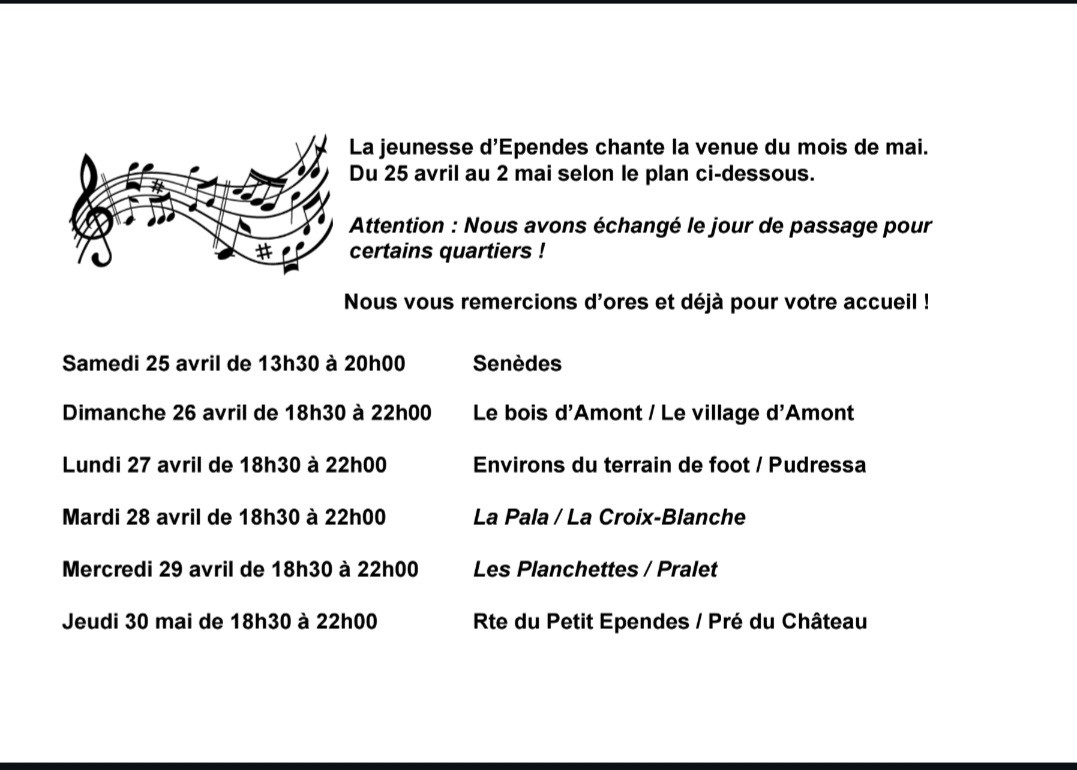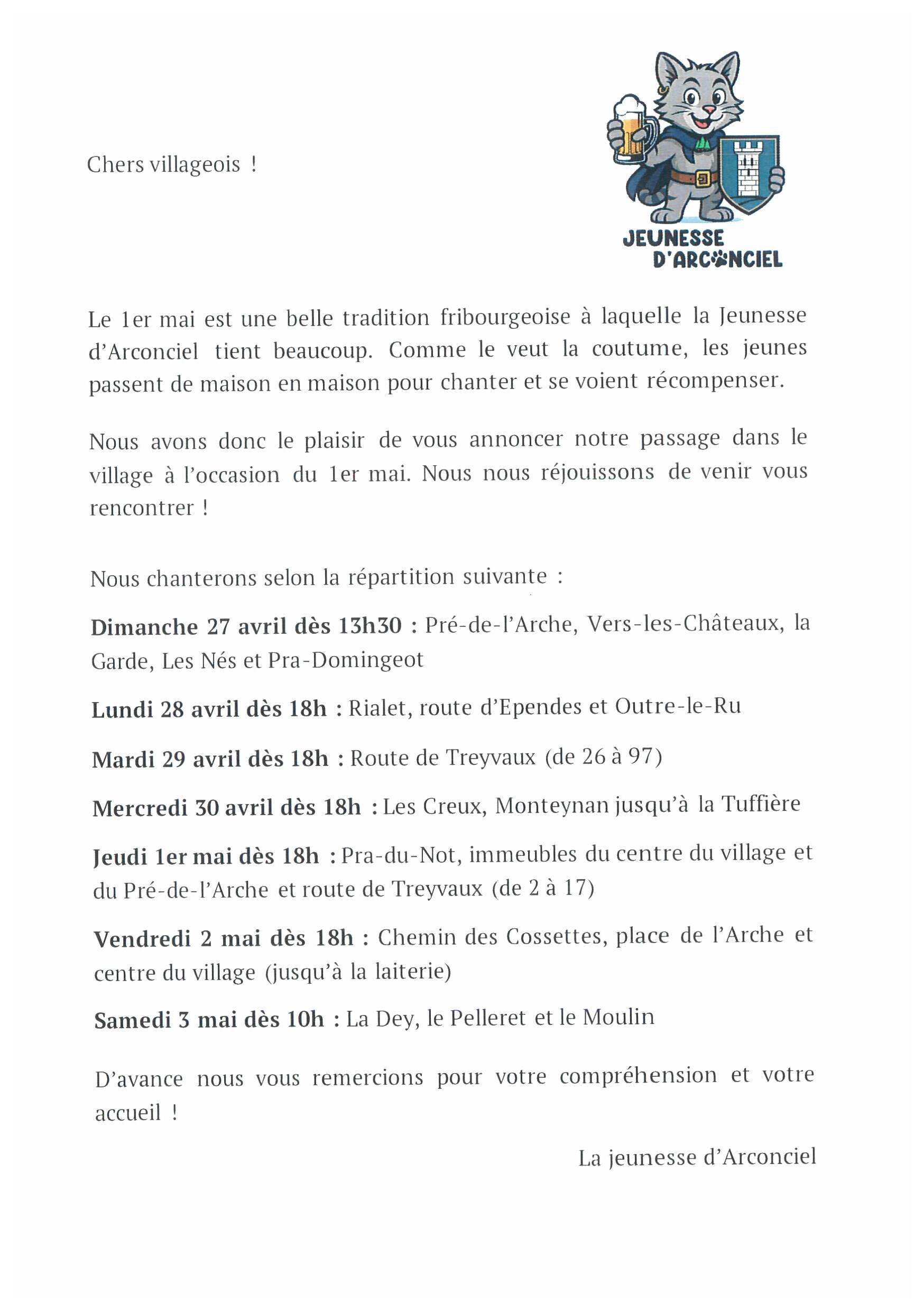Fidèle à la tradition fribourgeoise, les Sociétés de Jeunesse de nos villages ont le plaisir de vous annoncer leur passage chantant pour la venue du mois de mai.