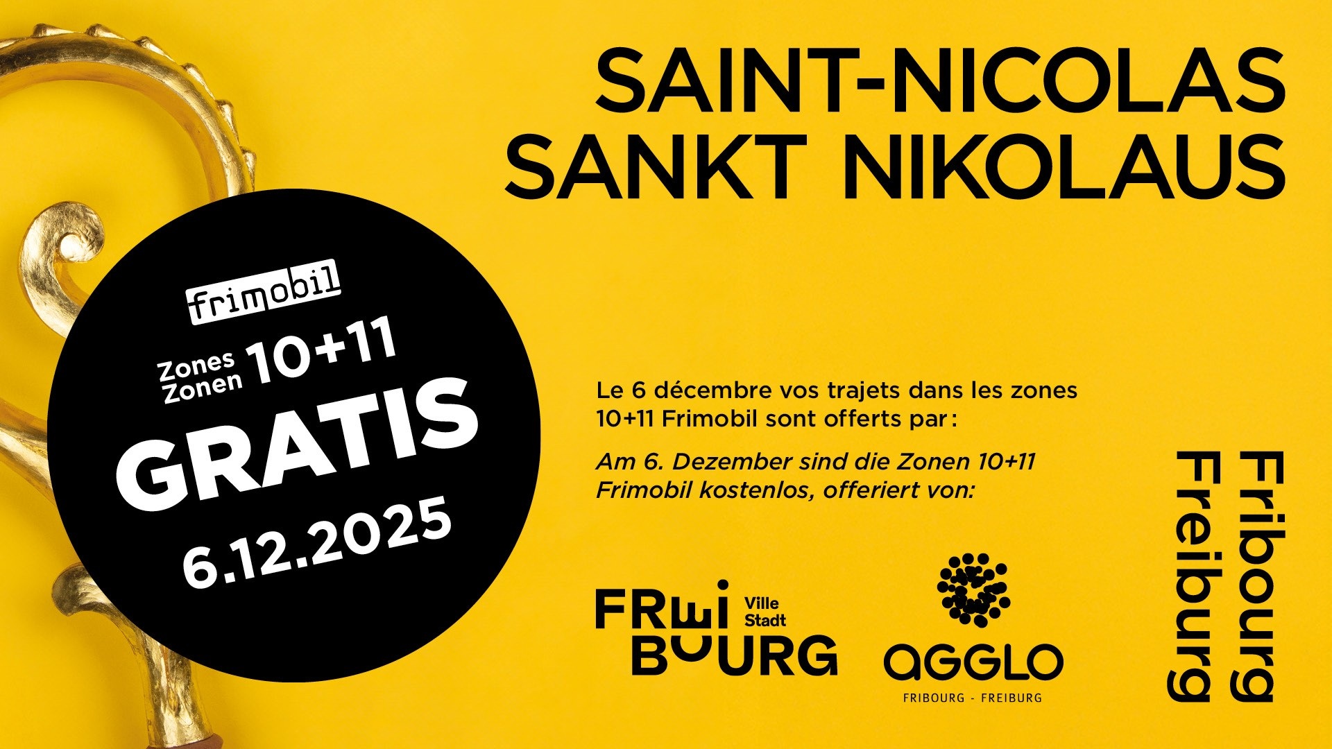 Pour la troisième année consécutive, les communes de l’Agglomération de Fribourg et la Ville de Fribourg offrent la possibilité à la population de voyager gratuitement en transports publics (bus et train) sur l’ensemble des zone 10 et 11 frimobil durant toute la journée du 6 décembre 2025.
